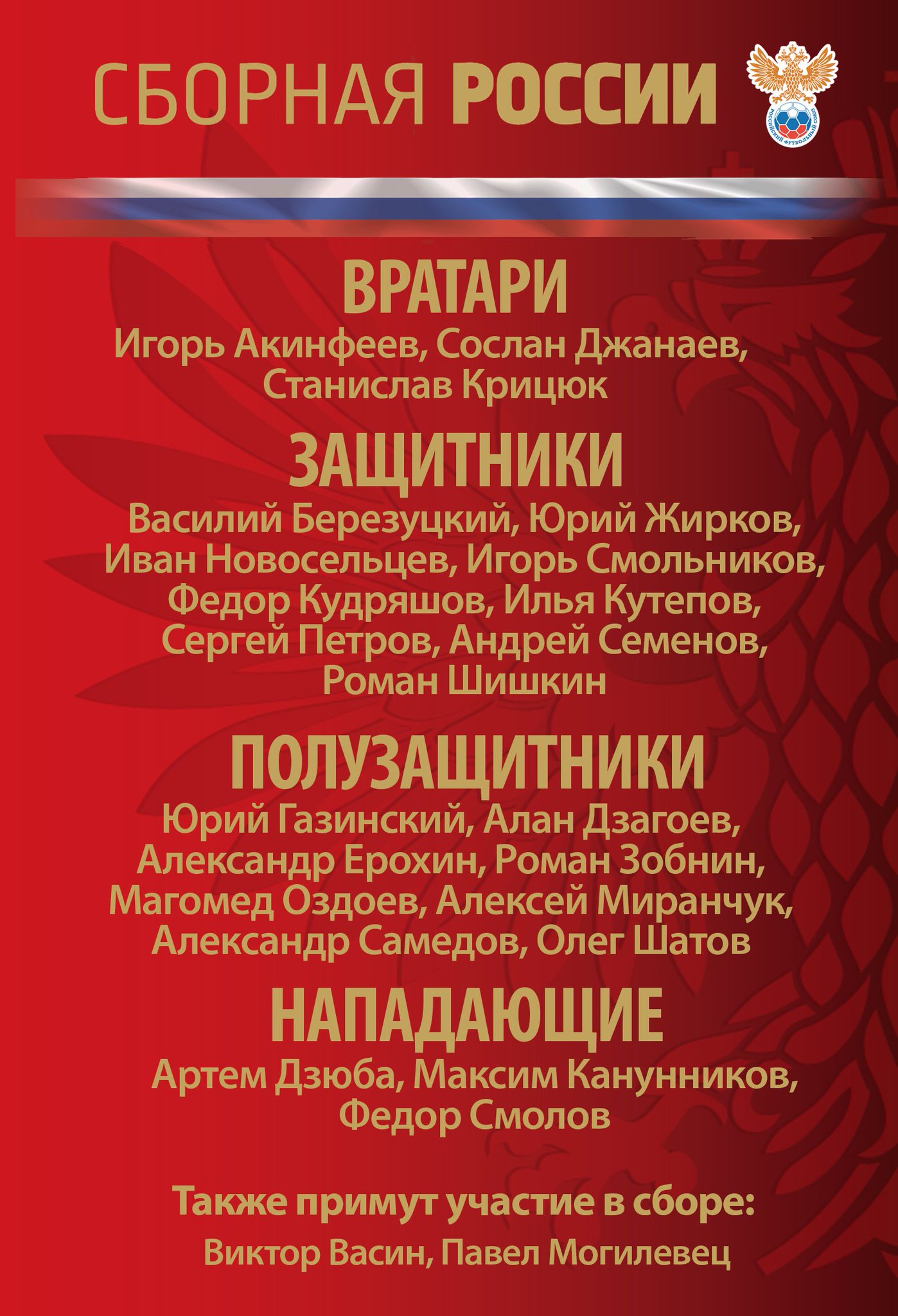 Помимо них, в список вошли вратари Игорь Акинфеев (ЦСКА) и Сослан Джанаев («Ростов»), защитники Василий Березуцкий (ЦСКА), Юрий Жирков, Иван Новосельцев, Игорь Смольников (все – «Зенит»), Федор Кудряшов («Ростов»), Илья Кутепов («Спартак»), Андрей Семенов («Терек»), Роман Шишкин («Локомотив»), Виктор Васин («УФА»), полузащитники Алан Дзагоев (ЦСКА), Александр Ерохин («Ростов»), Роман Зобнин («Спартак»), Магомед Оздоев («Рубин»), Алексей Миранчук и Александр Самедов (все - «Локомотив»), Олег Шатов и Павел Могилевец (все - «Зенит»), нападающие Артем Дзюда («Зенит») и Максим Канунников («Рубин»).