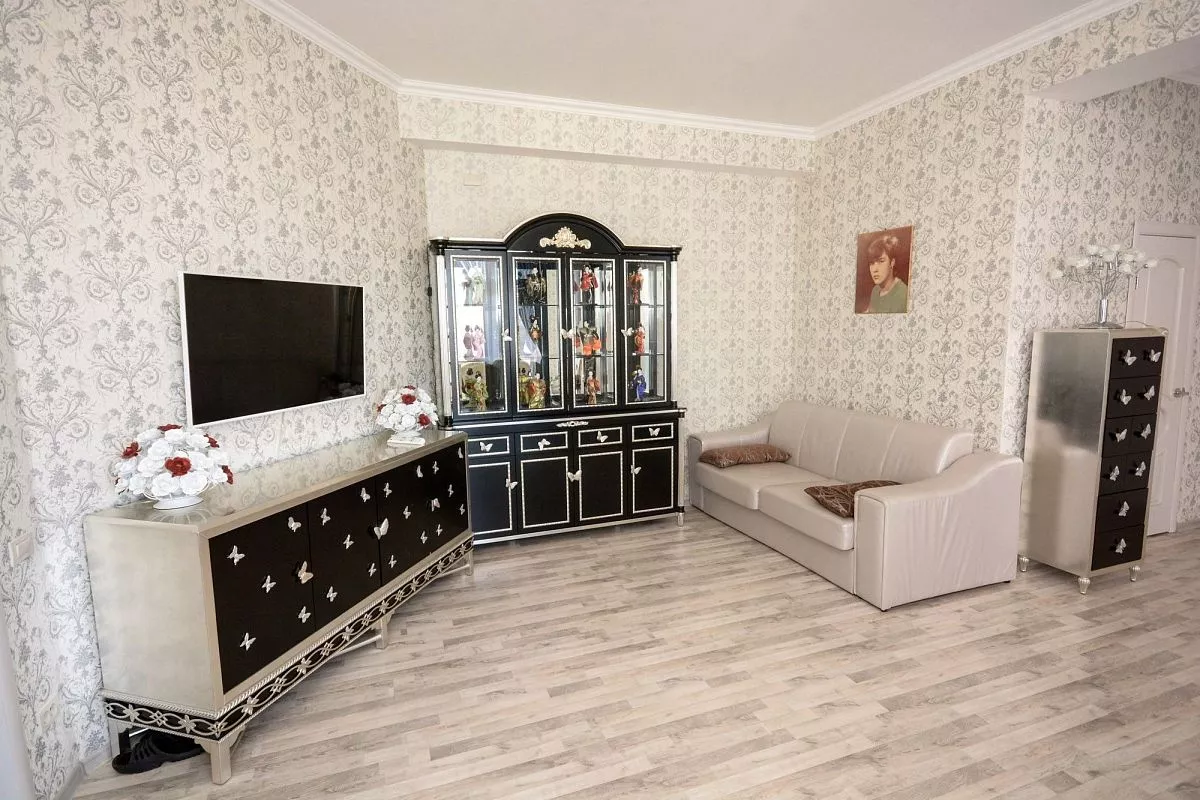 В квартире отличный ремонт, шикарная мебель. Справа от входа – уютная кухня с многочисленной бытовой техникой. Слева расположился диван, шкаф с фарфоровыми статуэтками в японском стиле и комод, на котором весточка из прошлого – светильники в виде белых роз. Одну стену в комнате украшает телевизионная плазма. На второй – портрет новоиспеченного хозяина квартиры в молодости.