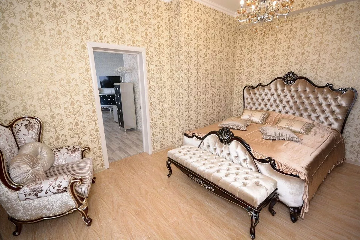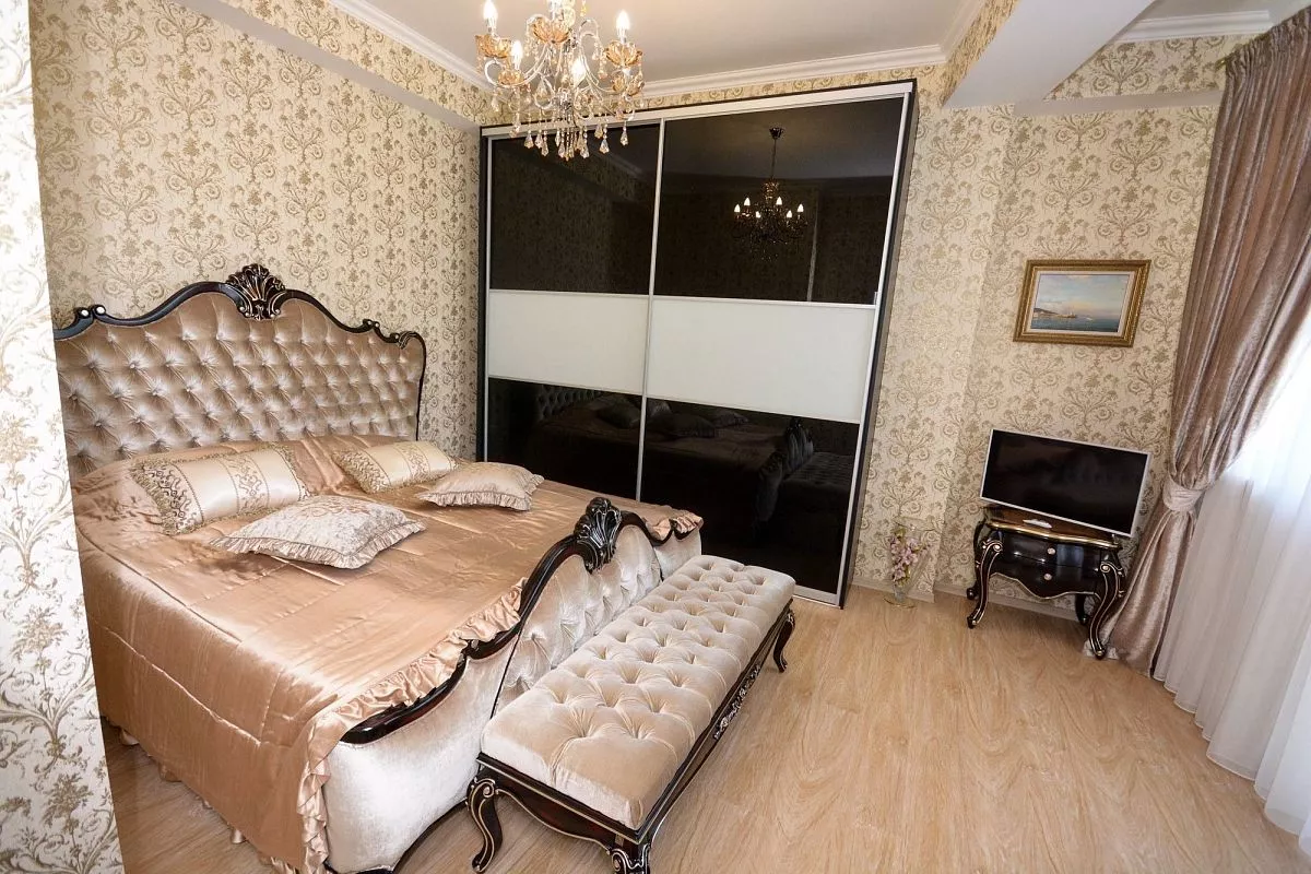 В спальне ничего лишнего: двуспальная кровать, мягкое кресло, раздвижной шкаф. Единственное украшение – изящные фигурки бабочек. Весь интерьер в апартаментах «звезды» оформлен в черно-белых тонах. Антикварная мебель - из Италии, хрустальные люстры – из Чехии.
