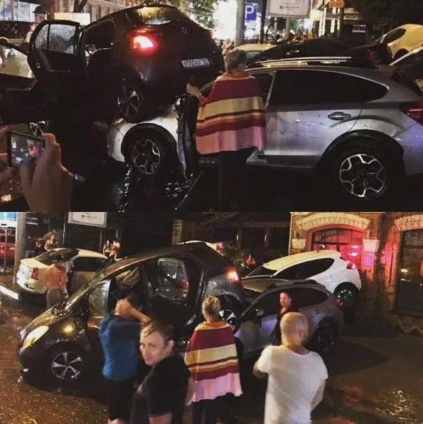 Припаркованные автомобили разбросало потоками воды по улицам города.