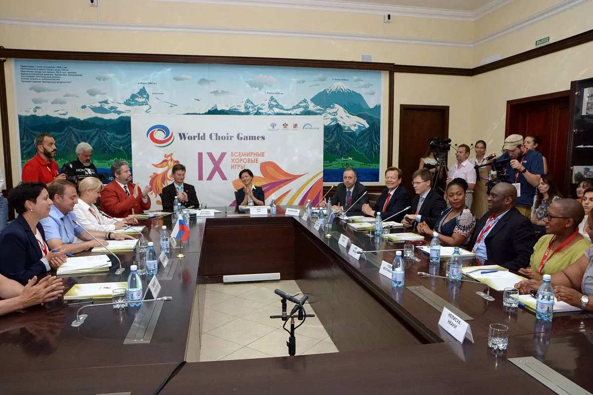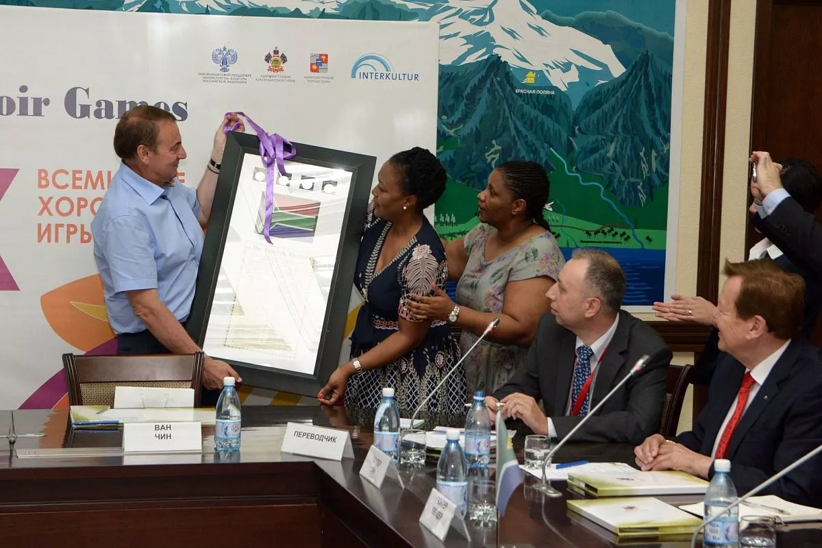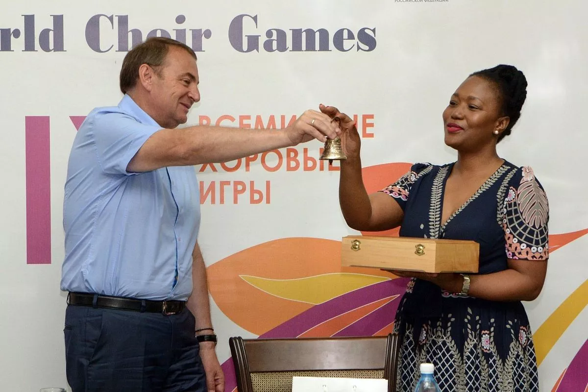 Флаг Всемирных хоровых игр представители ЮАР примут от мэра Сочи на церемонии закрытия мероприятия, 16 июля. Музыкальная олимпиада в Тсване пройдет с 4 по 14 июля 2018 года.