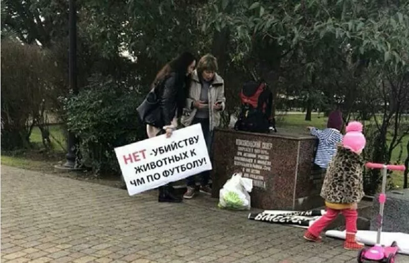 В Комсомольском сквере собрались местные жители с плакатами: «Нет убийству животных к ЧМ по футболу», «Нет тендеру на отстрел», «Требуем спасти животных!».