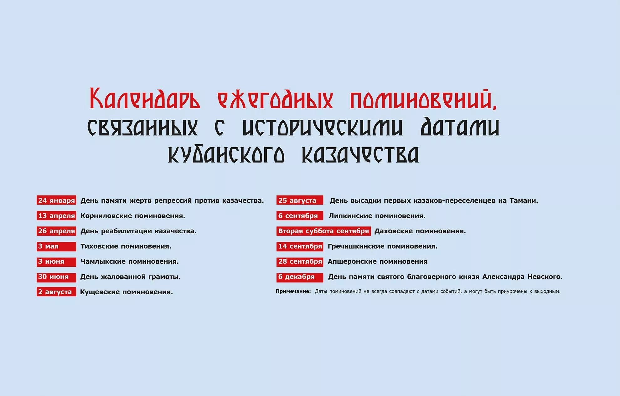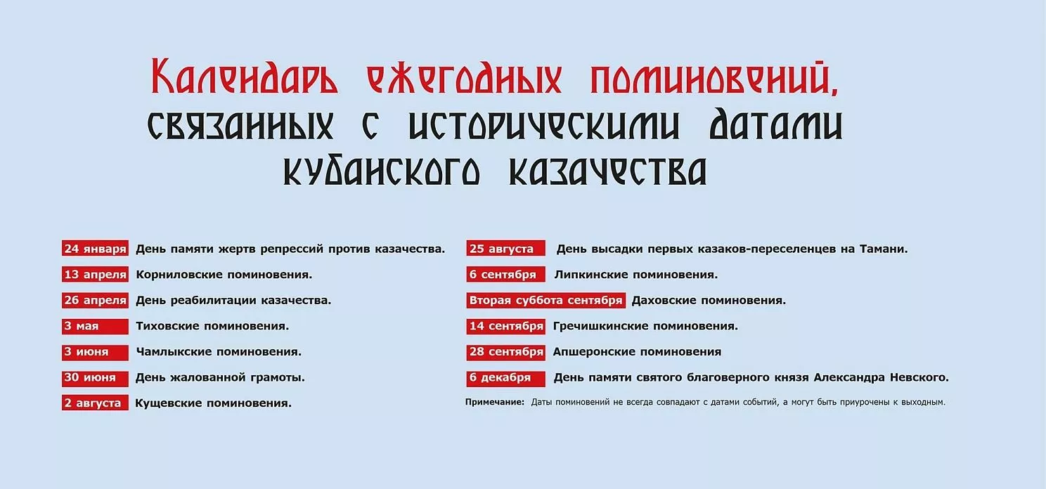 Кубанское казачье войско – самое крупное и организованное, здесь сохранились архивы, имена и места захоронений. Это позволяет проводить поминовения точно по датам и с именами. На Кубани поминовения связаны с былыми событиями Кавказской войны с сотнями боев и тысячами погибших, Гражданской войной с массовыми расстрелами во время расказачивания. Отдельная тема – героическое участие казаков в Великой Отечественной войне.