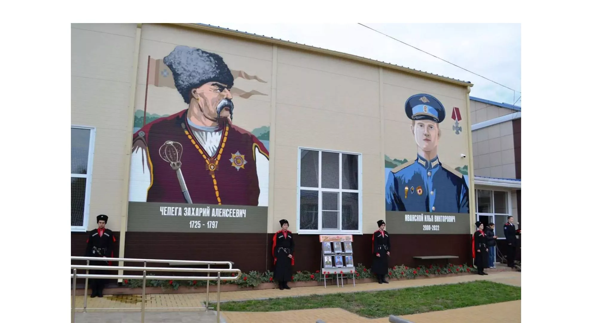 Эскизы муралов кошевого атамана Черноморского казачьего войска Захария Чепеги и выпускника казачьего корпуса 2018 года, участника спецоперации Ильи Иванского разработаны известным живописцем, потомственным казаком Вячеславом Лещевым из Санкт-Петербурга.