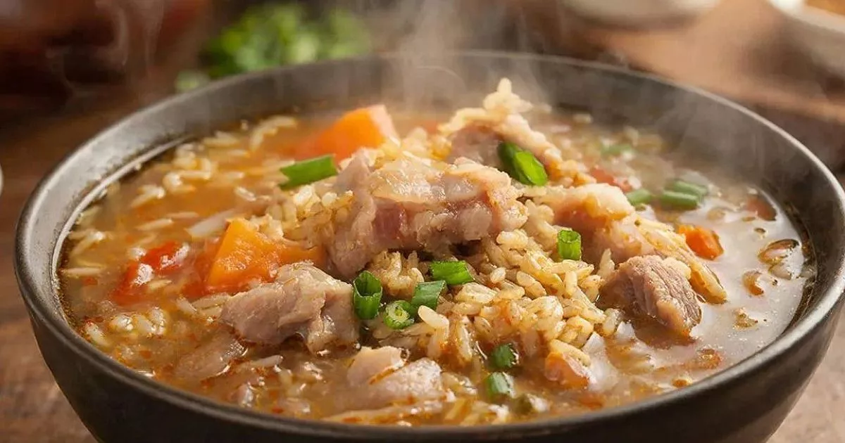 Готовим сытный китайский пряный суп с рисом и сочной свининой. Секрет — в правильном отрубе и обжарке мяса для насыщенного бульона.
