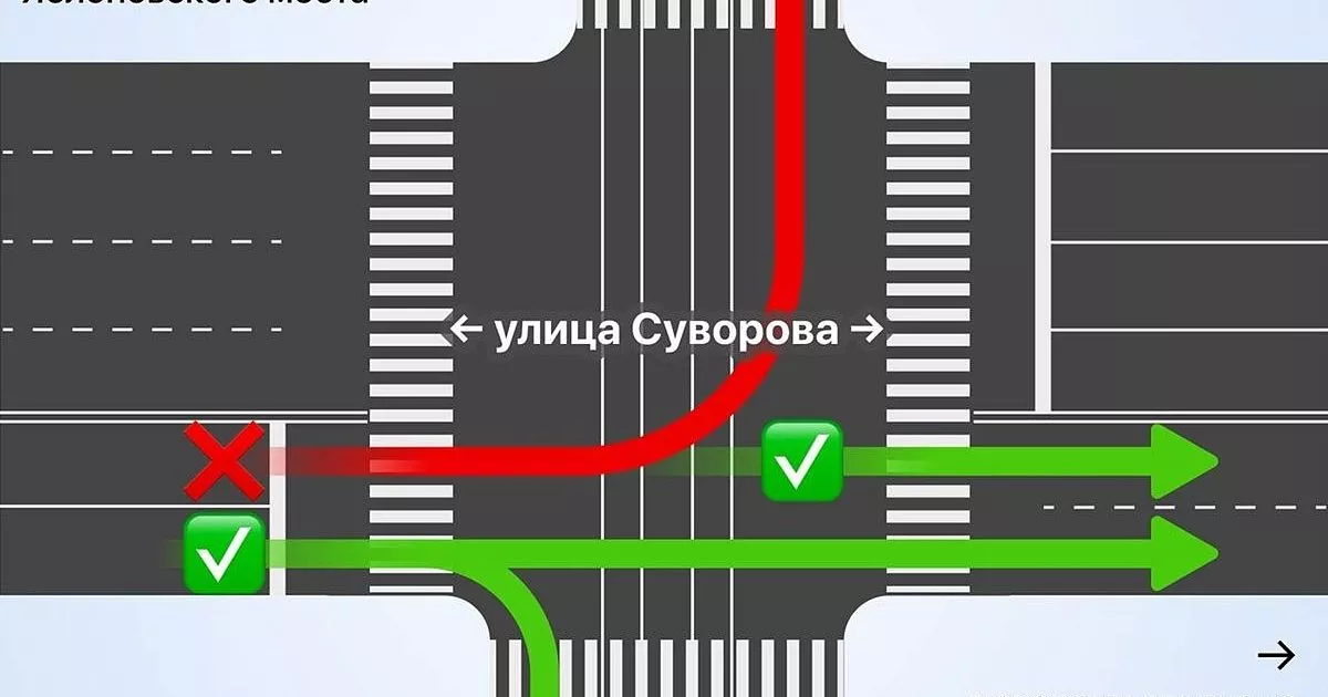 Уточняется, что при движении в сторону стадиона «Кубань» по улице им. Суворова будет запрещен левый поворот на им. Гоголя. Автомобилисты, как и прежде, смогут поворачивать направо к железнодорожному вокзалу «Краснодар-I».