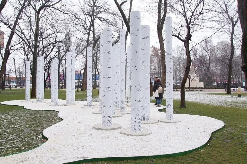 Скульптуру краснодарского художника Виктора Линского «Столпы» по результатам конкурса выбрали ведущие архитекторы, художники и дизайнеры города. Его работа вошла в тройку лучших вместе с композициями Владимира Омутова «Draped Data» и Михаила Смаглюка «Точка».