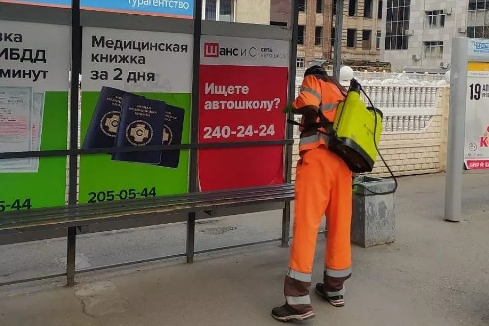 С утра дежурные бригады — 60 человек с ранцами, наполненными дезинфицирующей смесью, обрабатывают остановочные комплексы, а также подземные пешеходные переходы, лавочки на бульварах и в скверах, детские и спортивные площадки.