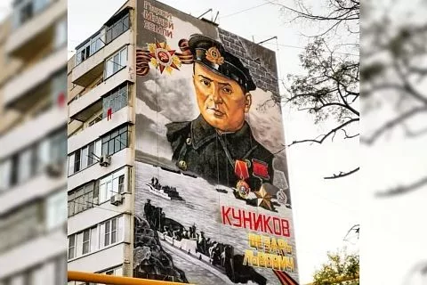 На фасаде дома №9 по улице Куникова появилось изображение Цезаря Куникова, командира десантного отряда малоземельцев.