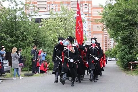 Так, перед домом участника Великой Отечественной и Почетного гражданина Краснодара Дмитрия Шлыкова два парадных расчета казаков и представителей Российского Союза ветеранов Афганистана прошли торжественным маршем.