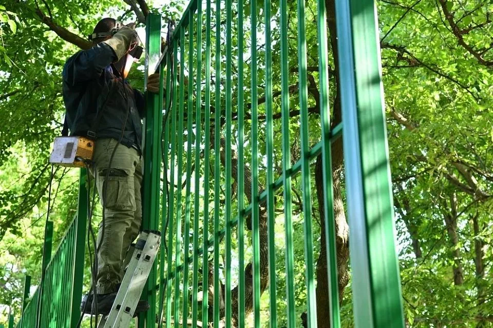 На участке уже установлены столбы ограждения, сделано основание, уложен асфальтобетон. Идет монтаж секций ограждения — их сделают более прочными и антивандальными.