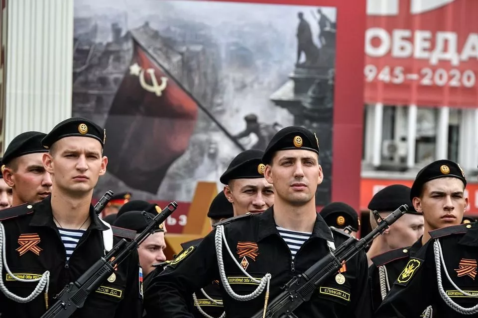 Перед трибунами прошли военнослужащие, одетые в форму времен Великой Отечественной войны, а также военнослужащие воздушно-десантных войск.