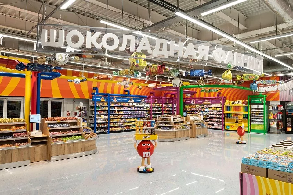 Дизайн выполнен в стиле шоколадной фабрики, созданы уникальные зоны по проектам ведущих поставщиков, появилось кафе, интегрированы цифровые сервисы. В ассортименте почти 25 тысяч позиций с фокусом на свежую продукцию, локальных производителей, товары для сбалансированного питания.