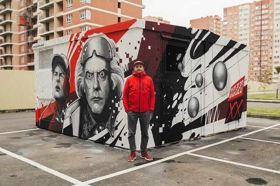Художник Ян Кузьмин создал в Краснодаре граффити с изображением героев легендарной трилогии «Назад в будущее» Доктора Брауна и Марти Макфлая.