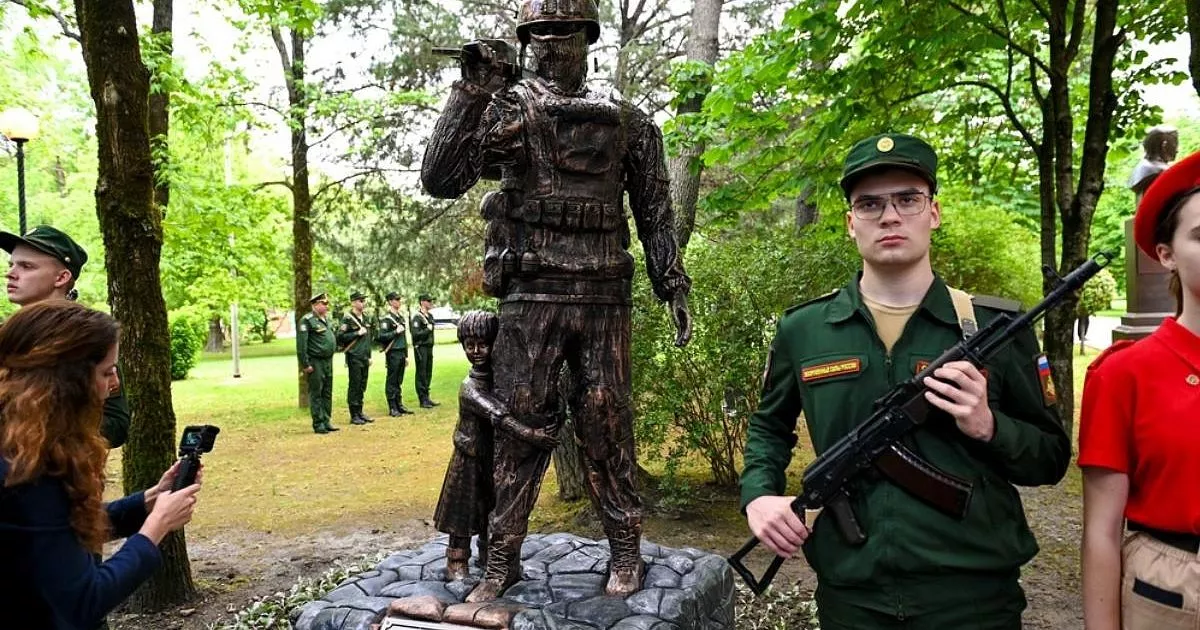 Скульптуру создал мастер из Ставропольского края, офицер запаса Александр Чаплыгин. Это собирательный образ – мемориал отражает суть и цели спецоперации по защите мирных граждан. Лицо воина в современном обмундировании закрыто маской, на плече ручной пулемет. За спиной бойца прячется маленькая девочка, которую солдат прикрывает собой.