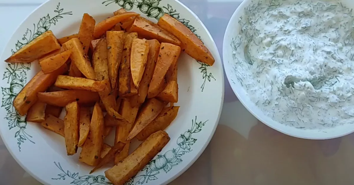Соус к батату из сметаны, головки чеснока и пучка укропа. Все ингредиенты смешивают и пробуют. Такая вкуснятина! Это бесподобно! Блюдо очень вкусное — такое, что пальчики оближешь. Давайте приступим к рецепту батата в духовке, которое готовится очень быстро и просто.