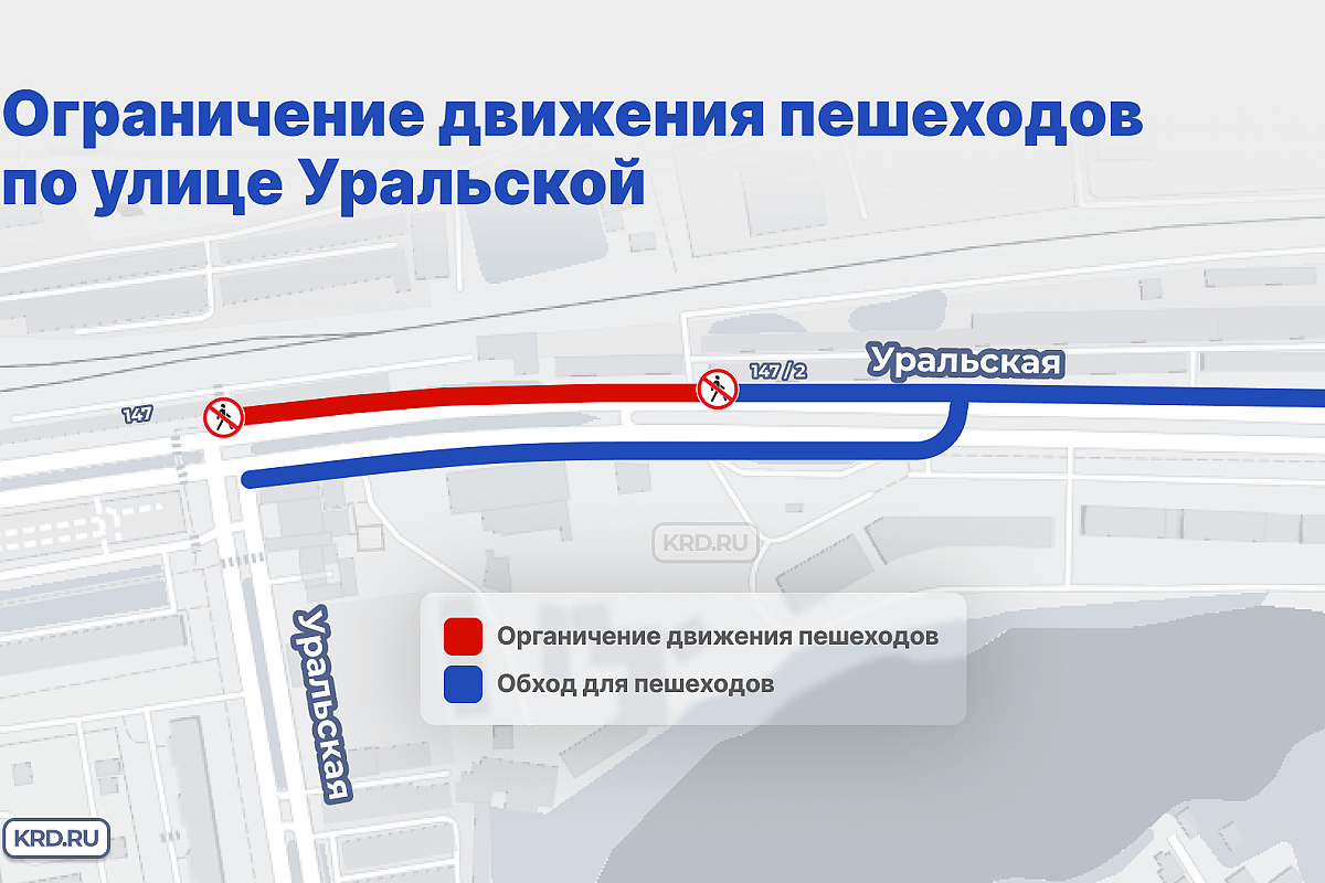 Движение пешеходов по ул. Уральской от дома № 147 (въезд в гаражный кооператив) до дома № 147/2 со стороны въезда в город будет ограничено с начала производства работ до завершения строительства надземного перехода.