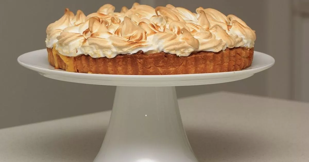 Когда пирог подрумянится, достаньте его из духовке, дайте немного остыть. Затем ложкой красиво выложите безе поверх начинки. Еще раз поставьте пирог в духовку на 15 минут, чтобы закрепить белковые пики. Приятного чаепития!
