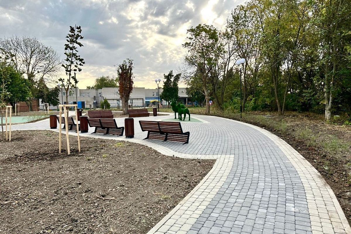 Парк в станице Старовеличковской, Калининский районДля комфортного отдыха людей разного возраста в парке проложили пешеходные дорожки, обустроили детскую игровую площадку, установили тренажерные комплексы. Вдоль прогулочных зон поставили лавочки, скамейки и урны. Рядом обустроена парковка. На территории площадью в 2,5 гектара высадили 170 деревьев разных пород и больше 80 кустарников.