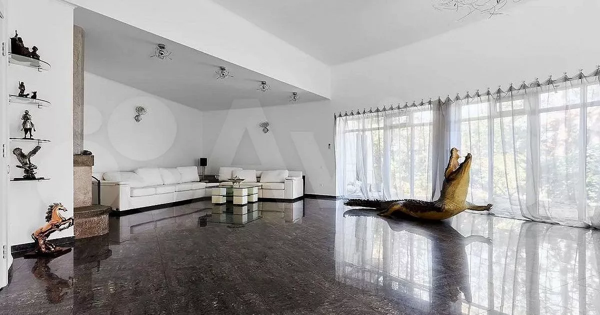 Открывает подборку дом площадью 1100 кв. м, расположенный на участке 18 соток, который продают на «Авито» за 400 млн рублей. Внутри просторные спальни, кухня-столовая, зал с камином и просторная зона отдыха. На цокольном этаже расположены бильярдная, спортзал и хозяйственные помещения. Дом оборудован двумя зонами проживания, что позволяет комфортно проживать двум семьям. На придомовом участке расположены бассейн и гараж. В объявлении указано, что в доме выполнен косметический ремонт.