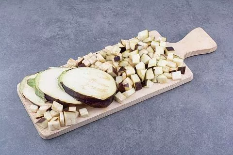 Как готовить? Первым делом, баклажаны необходимо промыть и нарезать кубиками среднего размера. Затем сложите все в глубокую миску, обильно посолите и оставьте на 20-30 минут. Это поможет избавиться от горечи, присущей этому овощу. По истечении указанного времени слегка отожмите баклажаны, чтобы удалить выделившуюся жидкость.