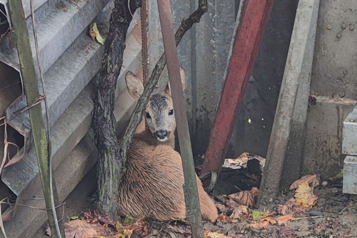 Животное, убегая от хищников, упало с опорной стены на участок – оно было обессилено и напугано.