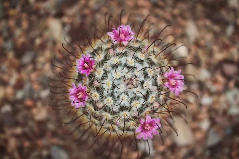 Маммиллярия. Эти миниатюрные «шарики» или «цилиндры», густо усыпанные колючками, расцветают весной или летом венком из крошечных, но многочисленных цветочков вокруг своей макушки.