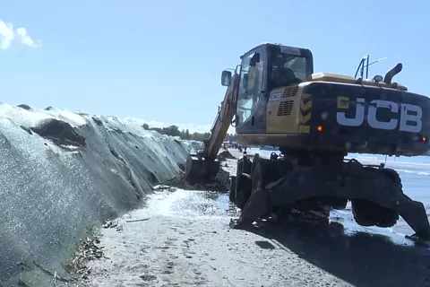 – Полностью завершены работы по созданию защитного вала и рва на всем 14-километровом участке от Лечебного пляжа до с. Витязево. На участке «Ракета» (район «Виктории») продолжаются работы по просеиванию песка и рыхлению грунта с применением техники ПУМА-2200. Укладка защитной сетки ведется на двух последних участках: в районе устья р. Можепсин (около 500 м) и в конце пляжей Витязево (около 1 км), - прокомментировал директор ООО «Курорты Анапы» Николай Заливин. – На участках у «Гранд Отеля», устья р. Можепсин и на пляжах Витязево несут дежурство четыре полноповоротных экскаватора для оперативного устранения возможных повреждений. В работах задействовано более 20 единиц техники, включая трассовые и вездеходные самосвалы, экскаваторы и просеивательные устройства.