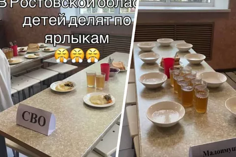 В социальных сетях появились фотографии из школьной столовой в городе Азов Ростовской области, на которых видно, что на столах висят таблички «Малоимущие» и «СВО». Председатель комитета Госдумы по защите семьи, вопросам материнства и детства Нина Останина резко раскритиковала такую практику, назвав её бесчеловечной и недопустимой. В интервью «Газете.Ru» она призвала немедленно убрать подобные обозначения.