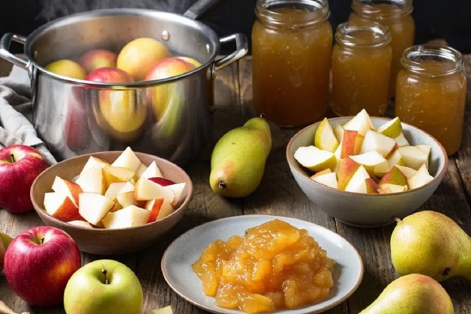 Яблоки и груши тщательно вымойте, очистите от сердцевины и нарежьте небольшими кубиками. Сложите фрукты в кастрюлю с толстым дном, добавьте немного воды (около 100 мл) и поставьте на средний огонь. Варите фрукты, периодически помешивая, до тех пор, пока они не станут мягкими и легко разминаемыми вилкой. Это займет примерно 20-30 минут.