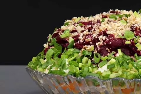 Аккуратно распределите по центру натертую свеклу. Готовый салат посыпьте измельченными грецкими орехами и украсьте зеленым луком.