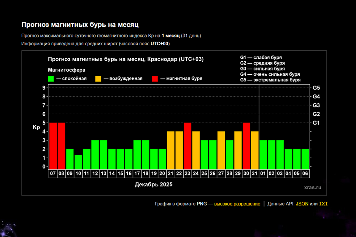 Магнитная буря уровня G1 может ударить по Земле 30 декабря. По данным долгосрочного прогноза на сайте Лаборатории солнечной астрономии ИКИ и ИСЗФ РАН, всплески активности, которые не достигнут «красной» зоны, также ожидаются 29 и 31 числа. А в начале следующего года магнитосфера нашей планеты перейдет в спокойное состояние.