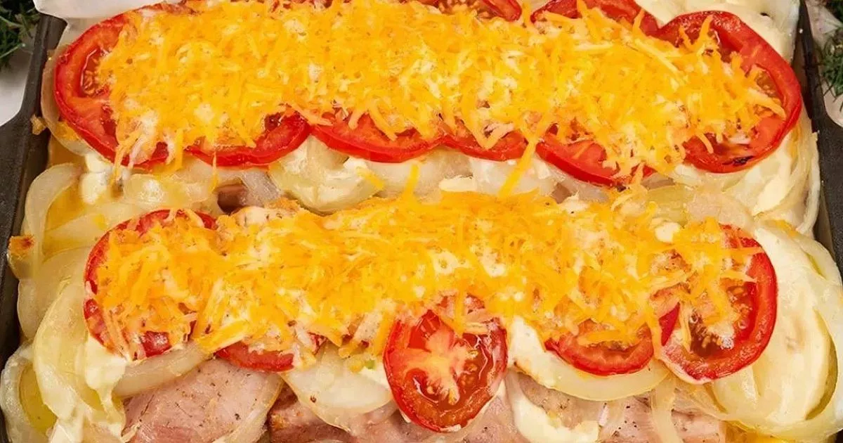 Секрет этого блюда в том, что оно собирается, как конструктор. Нужно лишь понять логику: сочное мясо внизу, сочная «подушка» из лука и помидоров посередине и хрустящая сырная шапка сверху.