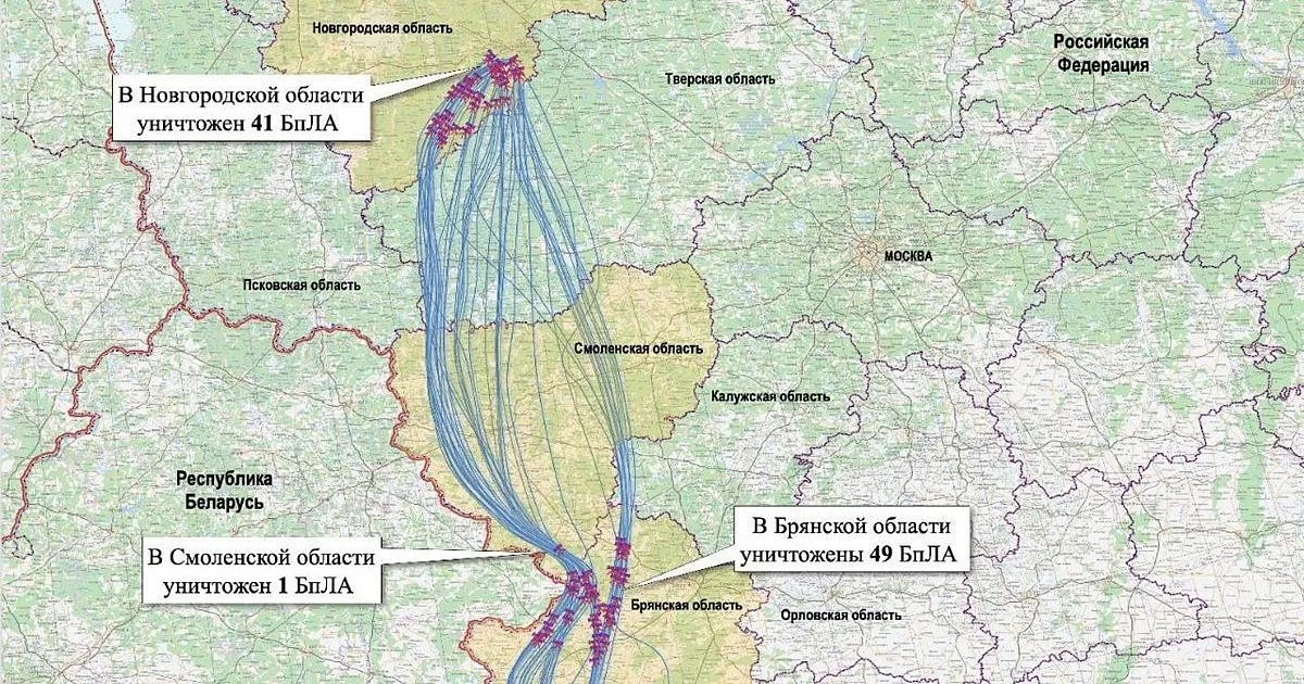 - Нанесение удара противником, как показано на представленной карте, осуществлялось по нескольким направлениям к резиденции Президента России над территориями Брянской, Смоленской, Тверской и Новгородской областей с применением девяносто одного беспилотного летательного аппарата, - проинформировал Романенков.