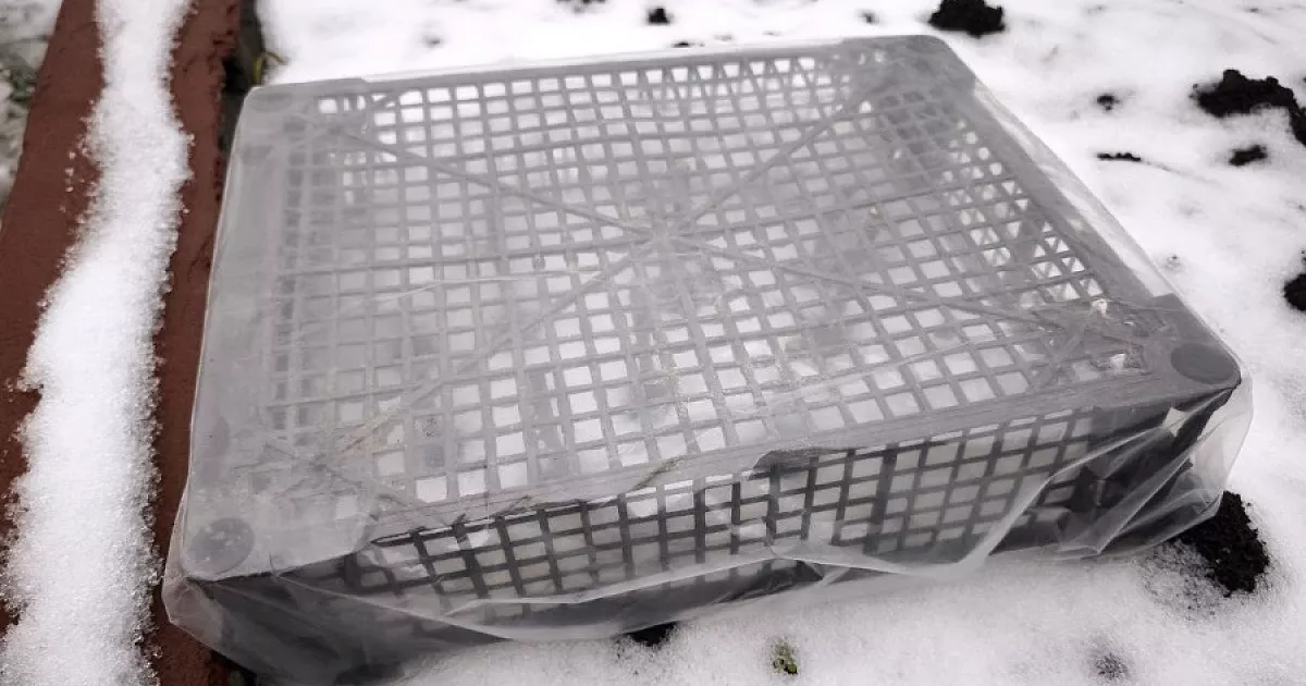 Для спасательной операции требуются 2 вещи: пластиковый ящик-решетка из-под овощей или фруктов (с отверстиями) и кусок прозрачной полиэтиленовой пленки. Это может быть старая плотная пакет-майка или часть упаковки. Из инструментов необходим всего лишь степлер.