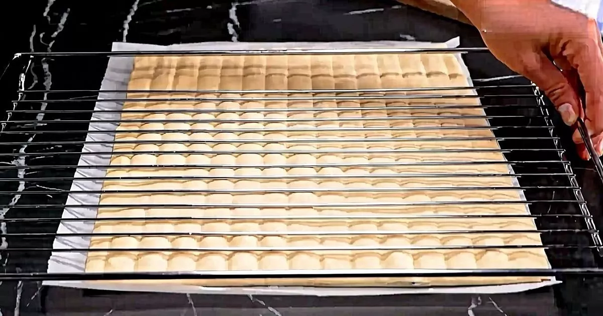 Накройте начинку вторым листом теста. Возьмите решетку от духовки и прижмите ее к «пирогу» крест-накрест.