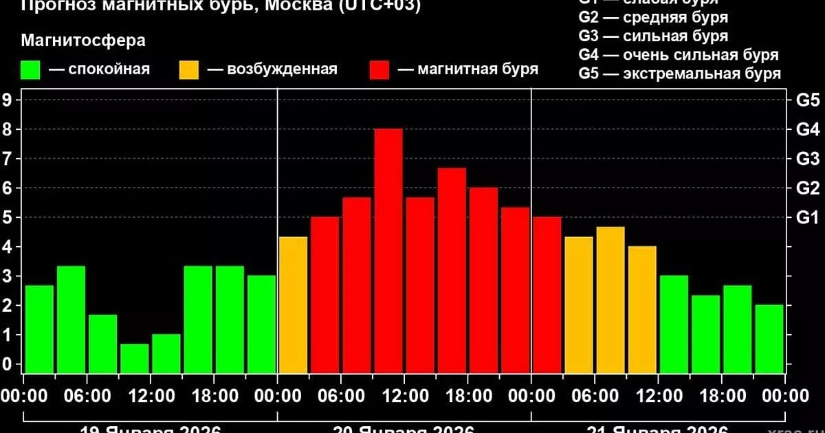 Уточняется, что международный прогностический центр заявил об ожидающейся магнитной буре, которая может превысить уровень G4.