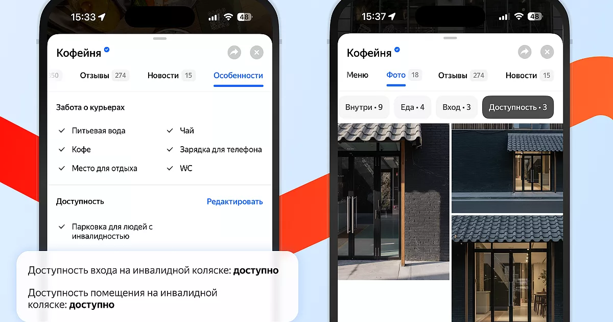 Чтобы найти заведения, подходящие для людей с ограниченной мобильностью, нужно в поиске «Карт» выбрать категорию «Где поесть» и активировать фильтр «Доступность входа на инвалидной коляске». Также можно проверить доступность конкретного заведения в разделе «Особенности» его профиля. Кроме того, в блоке «Доступность» можно посмотреть фотографии заведения.