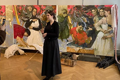 – История экспозиции берет начало в нашей предыдущей выставке портретов героев СВО «По окопам переднего края», – рассказала Виринея Шигина. – Ее венцом был образ матери, которая благословляет эшелоны уходящих на фронт машин. Тогда же у моей мамы, режиссера Олеси Шигиной, родился документальный спектакль «Сестры» по историям жен, матерей, дочерей, сестер наших бойцов. Он был настолько пронзительным, что у меня появилась идея – отобразить это через картины.
