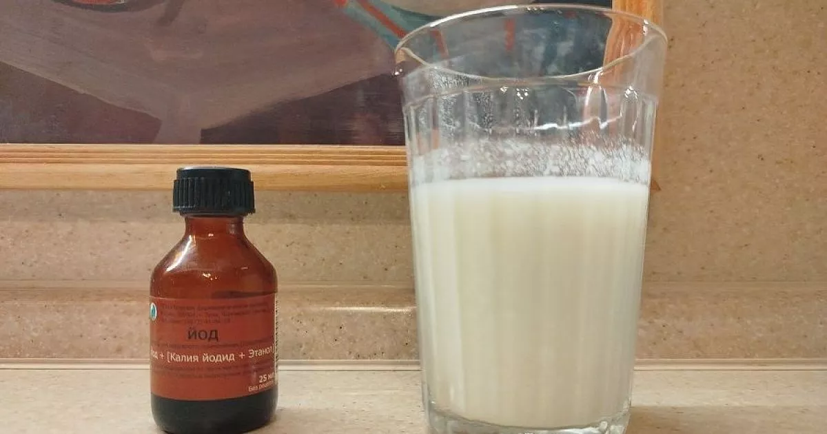 Для приготовления смеси необходимо взять полстакана молока, литр чистой воды и аптечный йод.