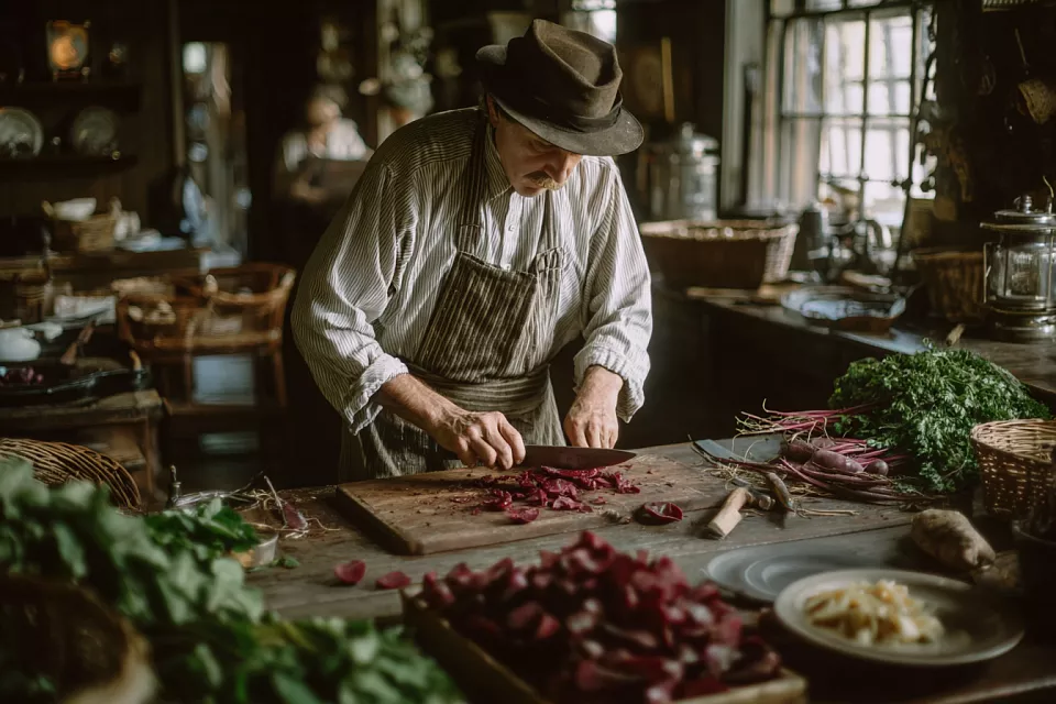 Он подчёркивает: маслины дают мягкий, солоноватый вкус, фасоль — сытость и белок, а горчица с уксусом связывают всё в цельное блюдо. При этом свёкла не доминирует, а скорее украшает блюдо, как и полагается в старинной подаче.