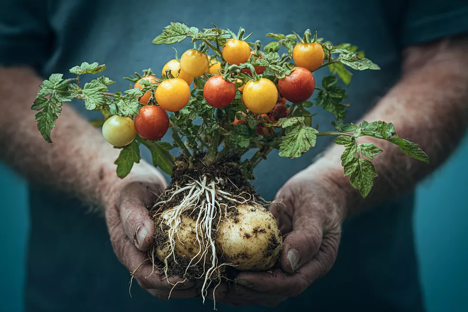 Фокус в том, что и помидоры, и картошка — из одного семейства паслёновых. Их стебли схожи по структуре, и если грамотно совместить томатный побег и картофельный корень, можно вырастить растение-гибрид. Такой приём используют в экспериментах, и иногда — просто ради удовольствия и удивлённых лиц соседей.