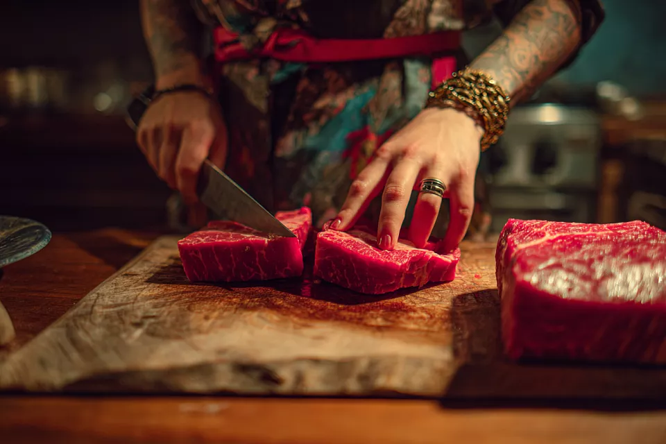 Берите любую говядину: лопатку, огузок, отбивные — всё подойдёт. Главное — нарезать очень тонко. Чем тоньше, тем мягче. Если не выходит — затачивайте нож или зовите мужа.