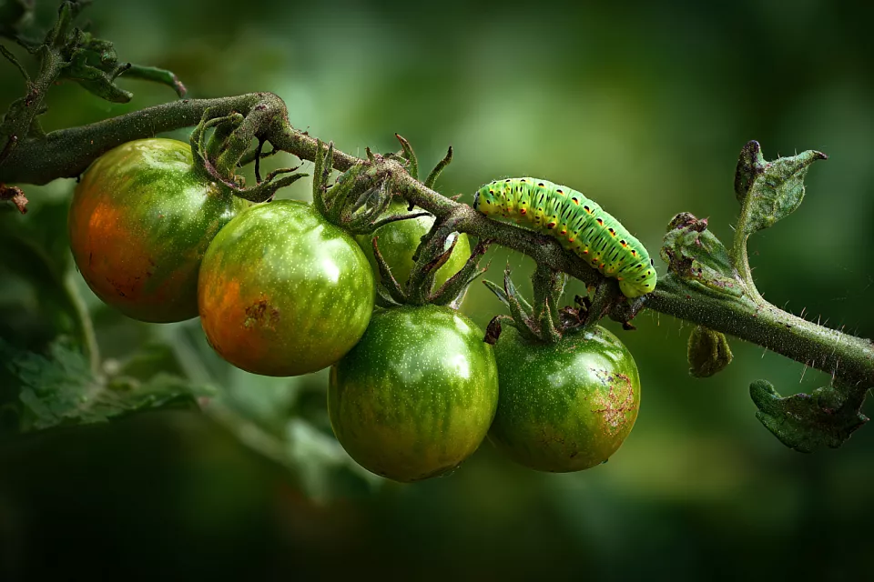Иногда причина, по которой помидоры не зреют, буквально ползает по кусту. Речь о гусеницах томатного и табачного бражников — это личинки ночных бабочек, которые питаются листьями и плодами томата. Их достаточно одной, чтобы куст остановил рост, сбросил завязи и замедлил дозревание плодов.