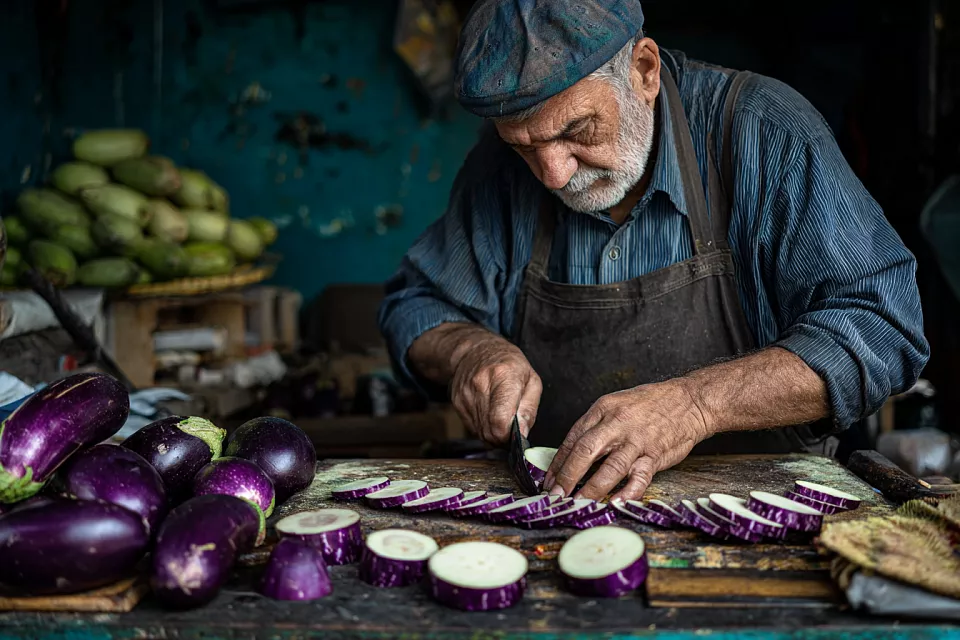 Он живёт в маленьком доме среди олив, базилика и огненно-красных перцев. В саду — десятки кустов баклажанов. Не простых, а особых: светло-фиолетовых, с нежной, почти сладкой мякотью.