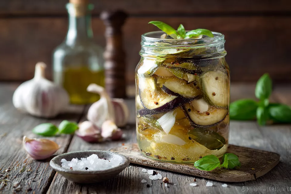 Маринад готовят из 1 ст. л. соли с горкой, 2 ч. л. 80%-го уксуса и 1 литра охлаждённой кипячёной воды. Жидкость должна быть слегка пересоленной, ведь баклажаны не солят заранее. В подходящую ёмкость укладывают слой баклажанов, сверху — чеснок и базилик, и повторяют, пока продукты не закончатся. Всё заливают маринадом так, чтобы овощи были полностью покрыты.