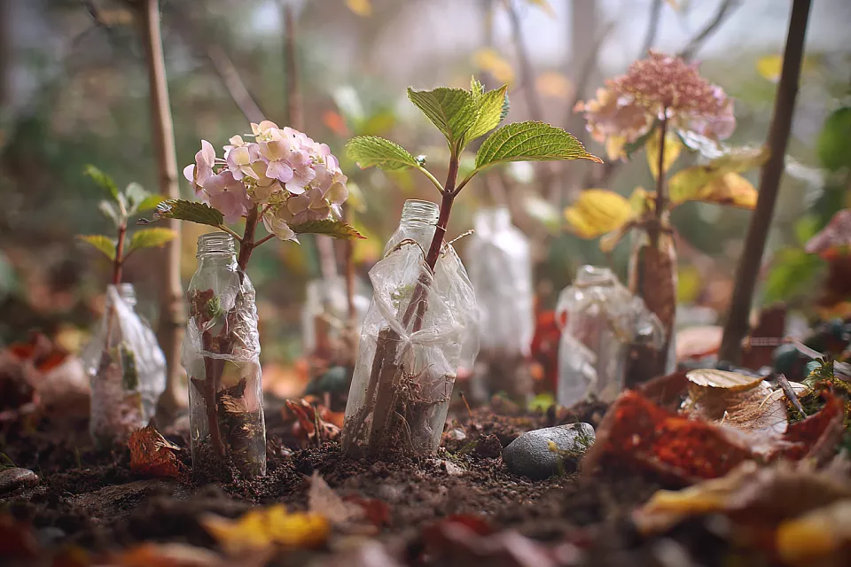 Для укоренения понадобятся пятилитровые пластиковые бутылки с крышками и спанбонд. Черенки высаживают в рыхлую, влажную почву в притенённом месте, например, в цветнике или на грядке, где нет прямого солнца. Солнечные участки вызывают перегрев и конденсат, что вредит укоренению. Черенки втыкают в землю наискосок, заглубляя нижнюю почку, на расстоянии 5–7 см друг от друга. На 2–3 черенка ставят одну бутылку, вдавливая её в почву так, чтобы листья не касались стенок. До наступления устойчивых заморозков (–5…–6 °C) бутылки оставляют закрытыми. Когда заморозки станут постоянными, крышки снимают, а бутылки накрывают двойным слоем спанбонда, фиксируя его камнями или кирпичами, чтобы защитить черенки зимой.