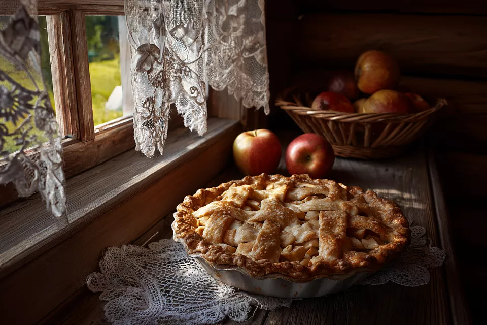 Основу готовят из охлаждённого песочного теста на сливочном масле. Первый круг раскатывают диаметром около 30 см и укладывают в форму. Сверху выкладывают яблочную начинку горкой. Второй пласт теста раскатывают немного меньше, разрезают на полосы и формируют классическую решётку. Излишки теста подгибают внутрь и делают декоративное «флюте» по краям. Это не только красиво, но и удерживает начинку.