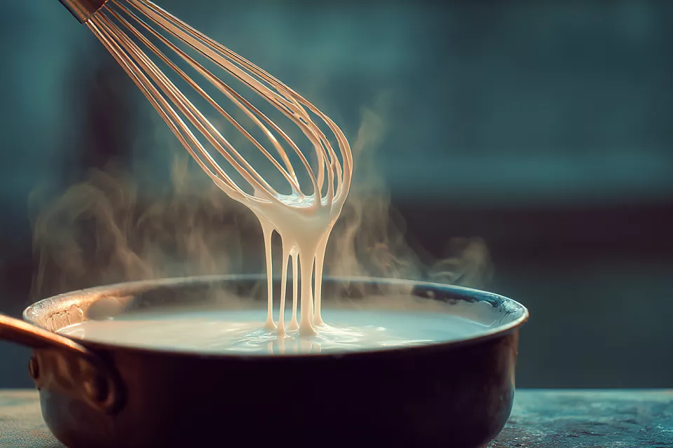 В кастрюлю влейте молоко, добавьте яйца, крахмал, подсластитель и немного ванили. Взбейте венчиком и готовьте на медленном огне до лёгкого загустения. Крем готов, если на поверхности остаются следы от венчика. Главное — не переварить!