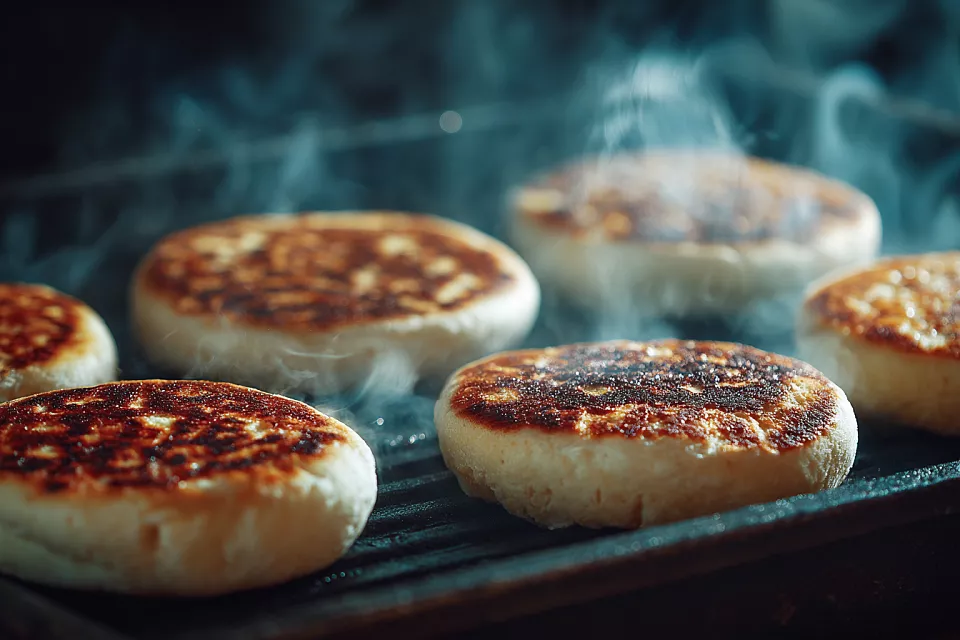 Жарят маффины на сухой чугунной сковороде при среднем огне по 8–9 минут с каждой стороны, до румяной корочки. Масло не используют. Внутри они остаются воздушными, снаружи — хрустящими. В Англии такие булочки разламывают вилкой, а не режут ножом, чтобы сохранить характерную пористую структуру.